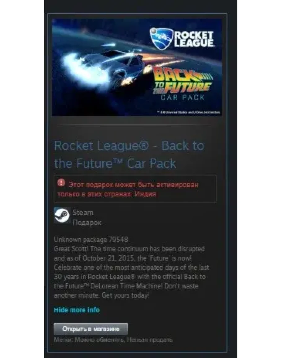 Великолепно, Скотт! Временной континуум был нарушен, и с 21 октября 2015 года «Будущее» уже наступило! Отпразднуйте один из самых ожидаемых дней последних 30 лет в Rocket League® с официальной машиной времени DeLorean из Back to the Future™! Не теряйте ни минуты. Получите свою сегодня!