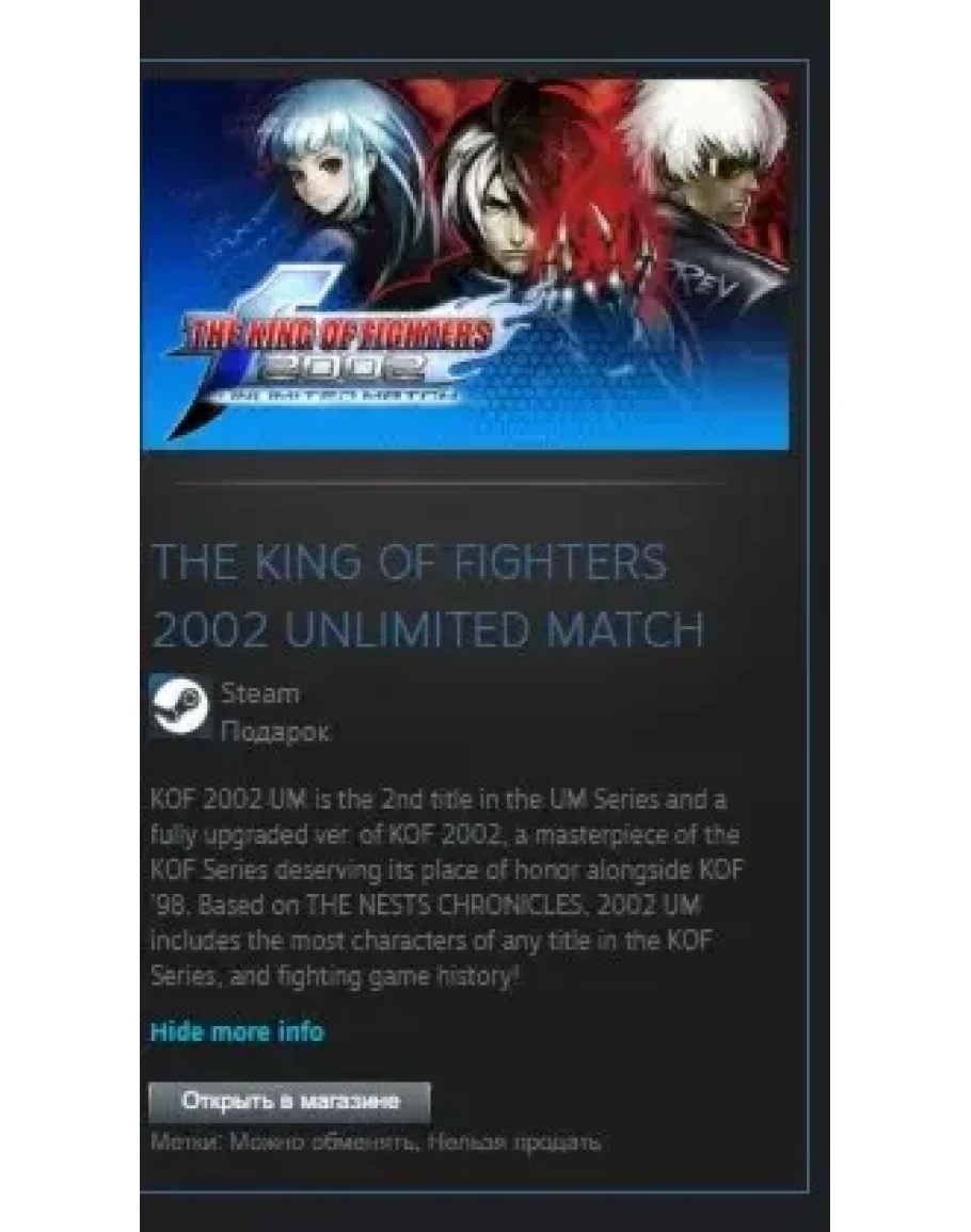 Второе название в серии UM - это полностью обновленная версия KOF 2002, шедевра серии KOF, заслуживающего почетного места наравне с KOF ’98. Это название, основанное на ХРОНИКАХ NESTS, включает в себя наибольшее количество персонажей из всех названий в истории KOF. Вся графика и фоновое музыкальное сопровождение были полностью переработаны, а игровой баланс также был значительно переработан. Добавлены новые приемы и возвращены другие, что означает, что игроки могут наслаждаться сражениями дольше, чем когда-либо.