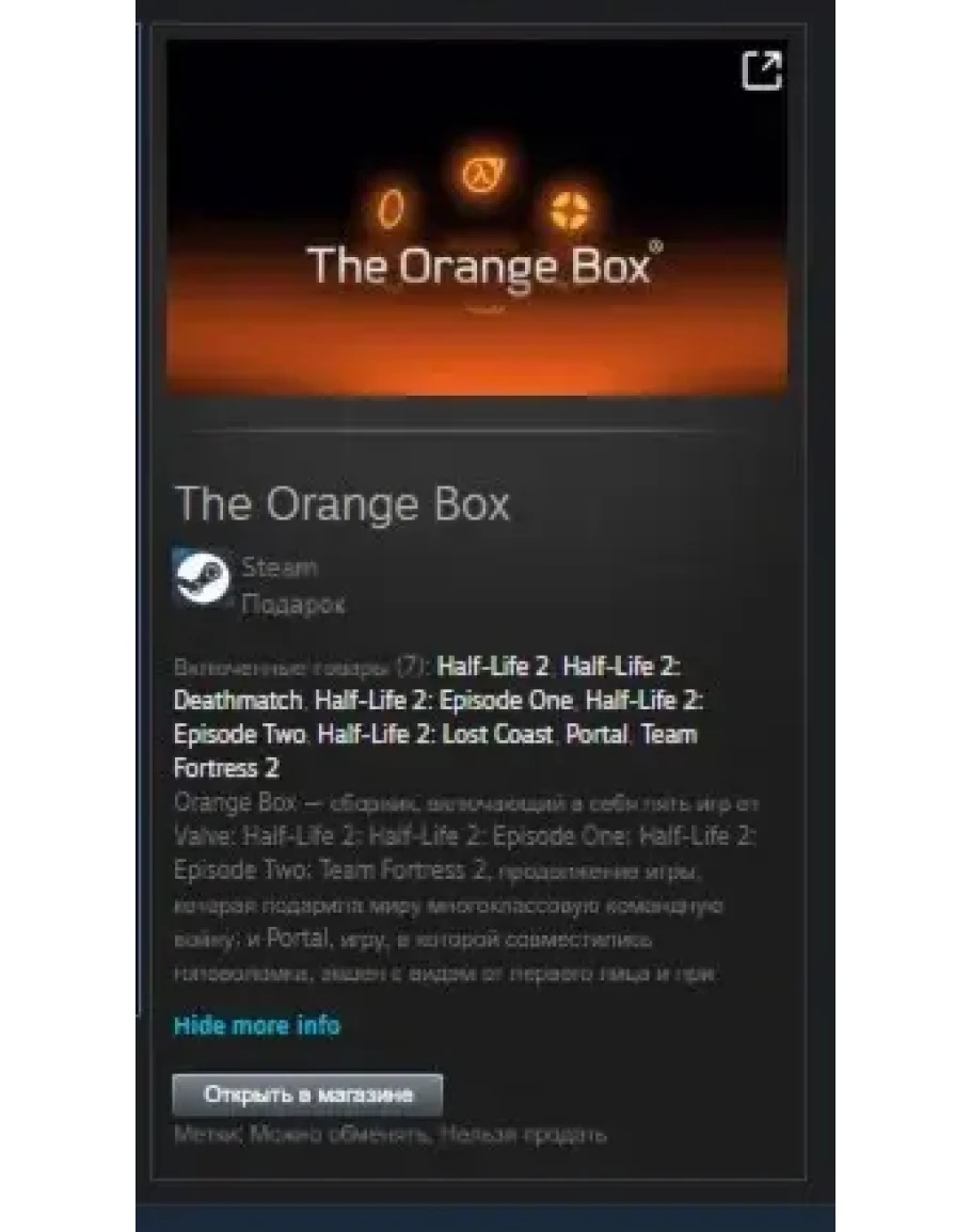 Включенные товары (7): Half-Life 2, Half-Life 2: Deathmatch, Half-Life 2: Episode One, Half-Life 2: Episode Two, Half-Life 2: Lost Coast, Portal, Team Fortress 2