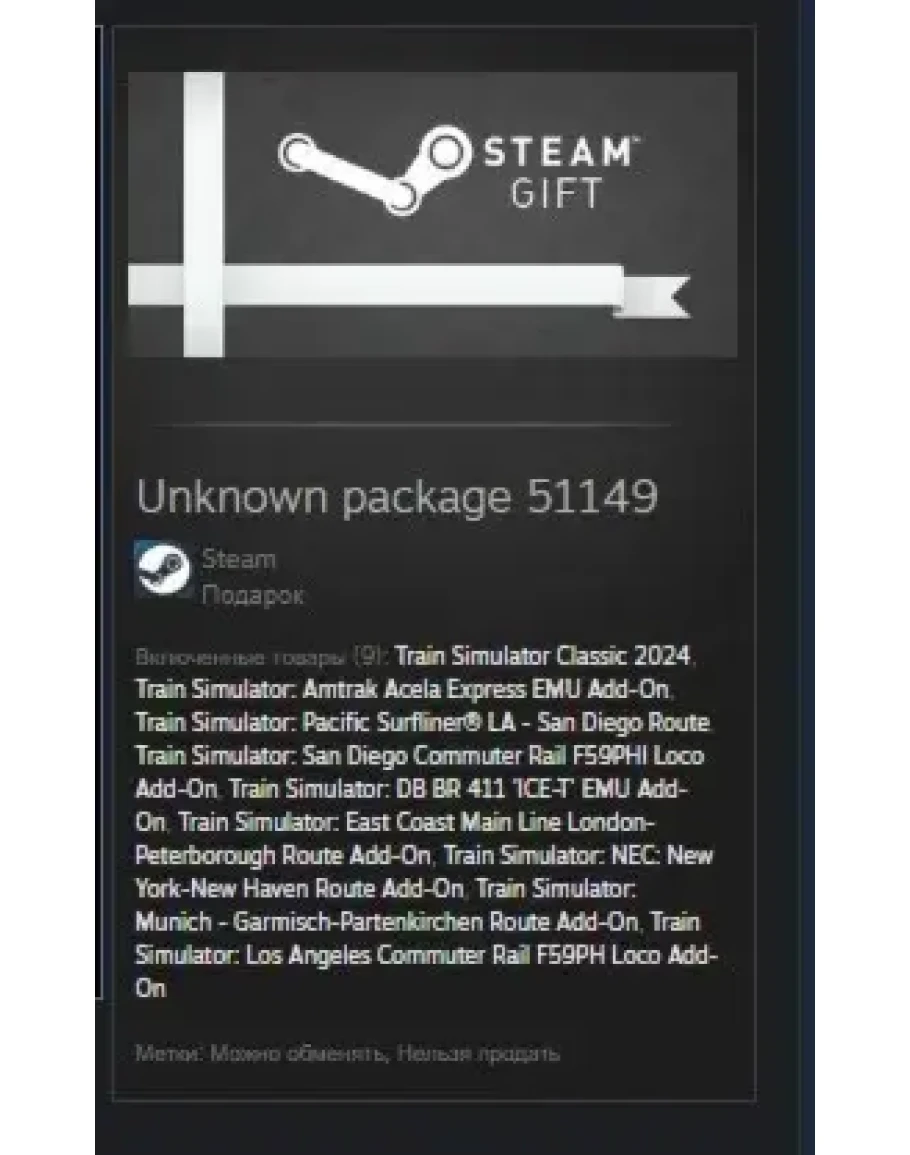Включенные товары (9): Train Simulator Classic 2024, Train Simulator: Amtrak Acela Express EMU Add-On, Train Simulator: Pacific Surfliner® LA - San Diego Route, Train Simulator: San Diego Commuter Rail F59PHI Loco Add-On, Train Simulator: DB BR 411 'ICE-T' EMU Add-On, Train Simulator: East Coast Main Line London-Peterborough Route Add-On, Train Simulator: NEC: New York-New Haven Route Add-On, Train Simulator: Munich - Garmisch-Partenkirchen Route Add-On, Train Simulator: Los Angeles Commuter Rail F59PH Loco Add-On