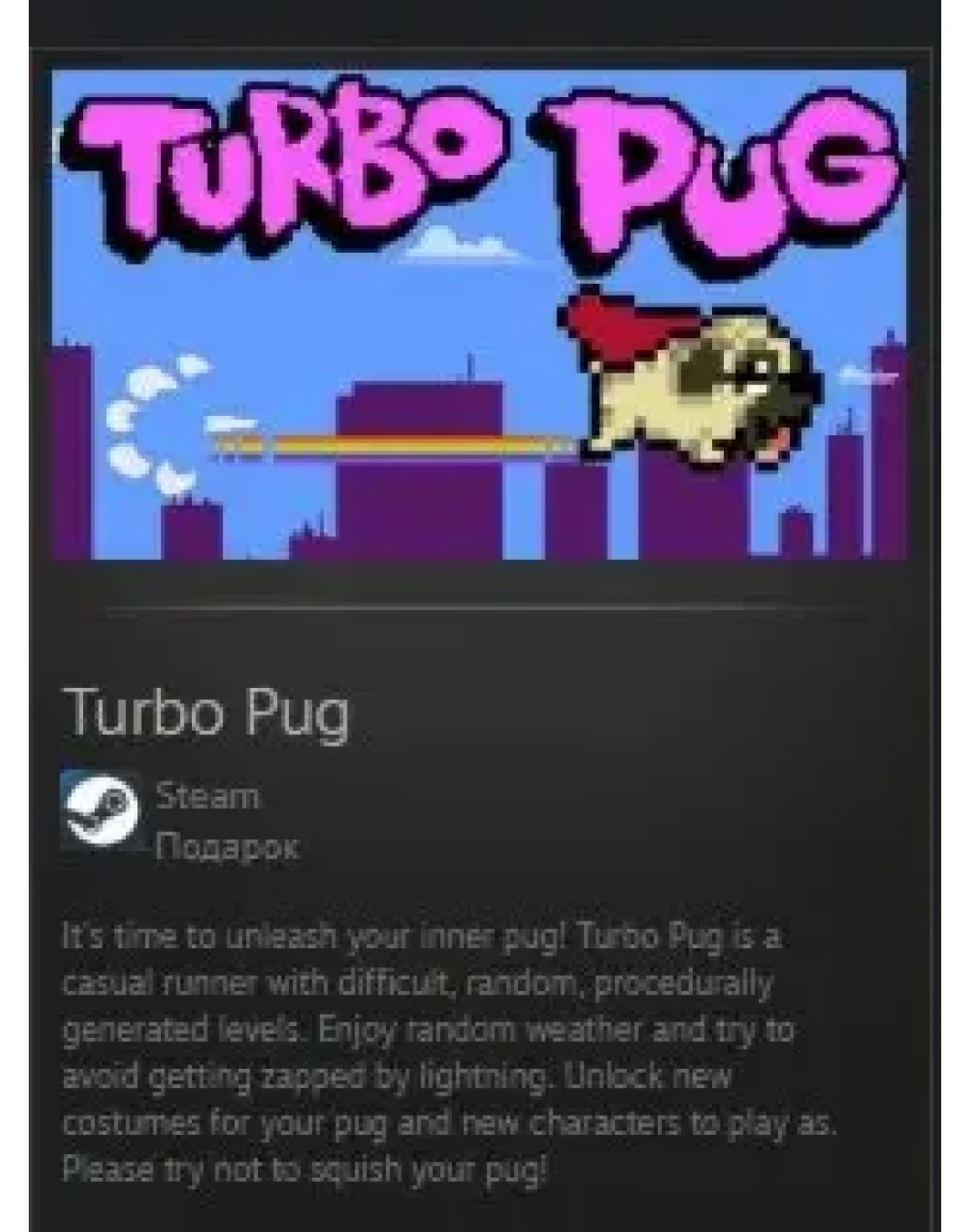 Пришло время дать волю своему внутреннему мопсу! Turbo Pug - это казуальный раннер со сложными, случайными, процедурно генерируемыми уровнями. Наслаждайтесь случайной погодой и старайтесь избегать попадания молнии. Открывайте новые костюмы для своего мопса и новых персонажей, за которых можно играть. Пожалуйста, постарайтесь не раздавить вашего мопса!