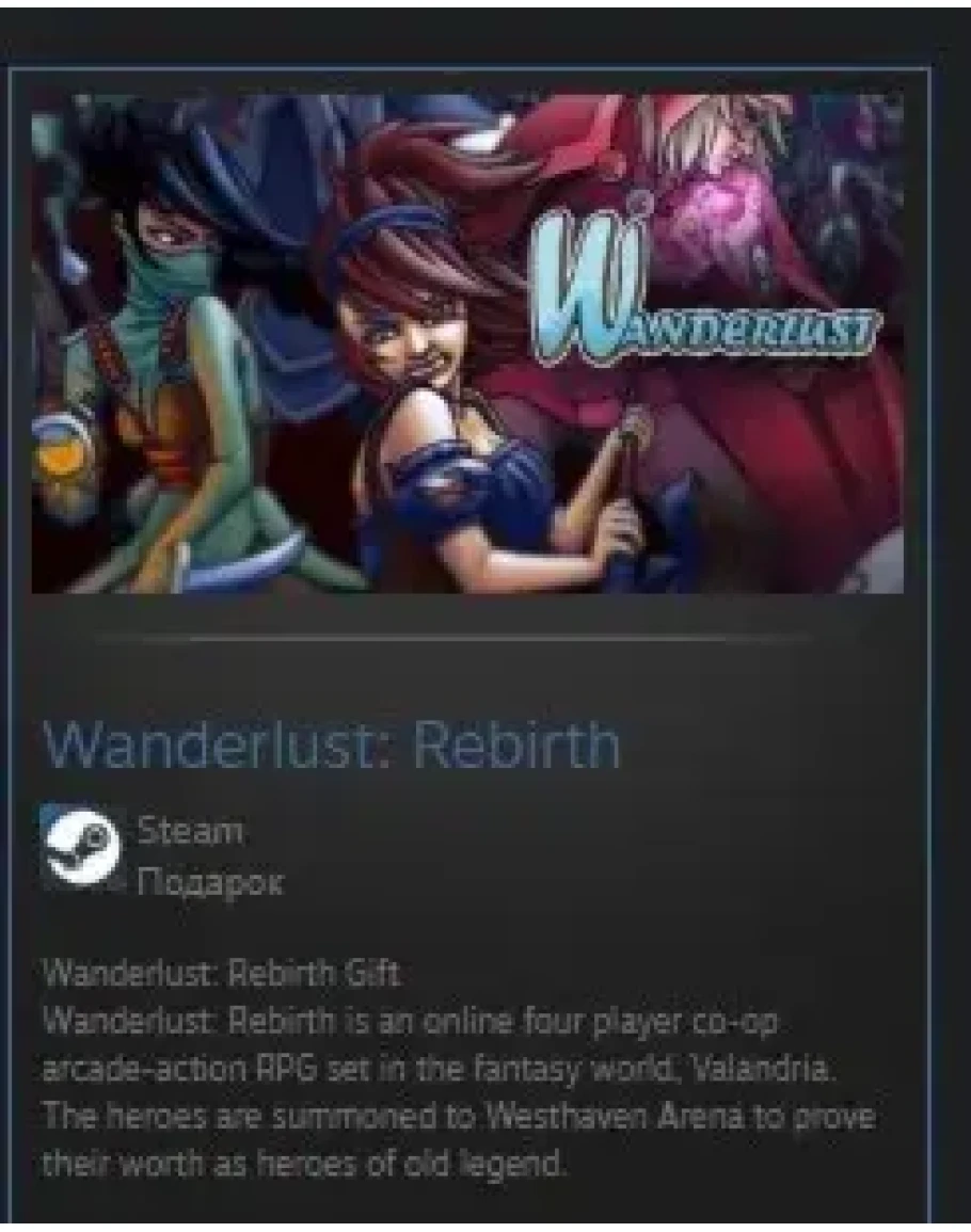 Wanderlust: Rebirth - это кооперативная аркадная ролевая игра для четырех игроков, действие которой разворачивается в фантастическом мире Валандрия. Героев вызывают на арену Вест-Хейвен, чтобы они доказали, что являются героями старой легенды.