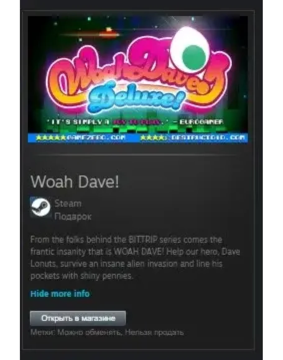 Ого, Дэйв! также в игре присутствует соревновательный режим для двух игроков, в котором два Дэйва могут сойтись лицом к лицу в битве за то, чтобы собрать как можно больше монет. Мы не преувеличиваем, когда говорим, что это вполне может привести к разрушению дружеских отношений и безнадежным бракам. Соревновательные игры хороши именно этим.