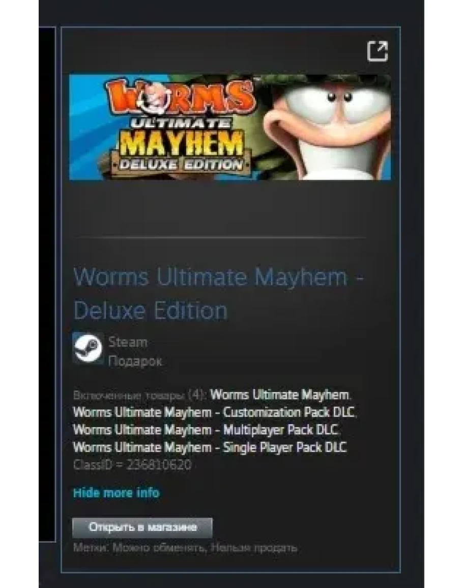 Включенные товары (4): Worms Ultimate Mayhem, Worms Ultimate Mayhem - Customization Pack DLC, Worms Ultimate Mayhem - Multiplayer Pack DLC, Worms Ultimate Mayhem - Single Player Pack DLC