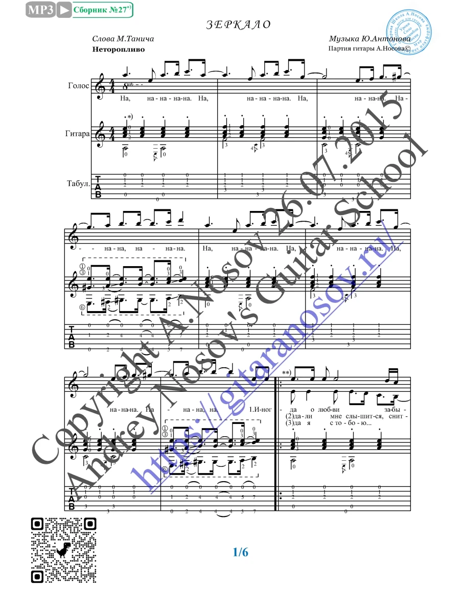 Кликните "Подробнее" для получения дополнительной информацииВашему вниманию предлагается композиция "Зеркало (муз.Ю.Антонова, сл.М.Танича)", предназначенная для вокала в сопровождении 6-ти струнной гитары (pdf / png*). Запись выполнена нотами и включает в себя партию вокала с подтекстовкой, партию гитары с подробнейшей аппликатурой, текст песни (НА РУССКОМ ЯЗЫКЕ). Партия гитары продублирована табулатурой. Прилагается ссылка на скачивание mp3.