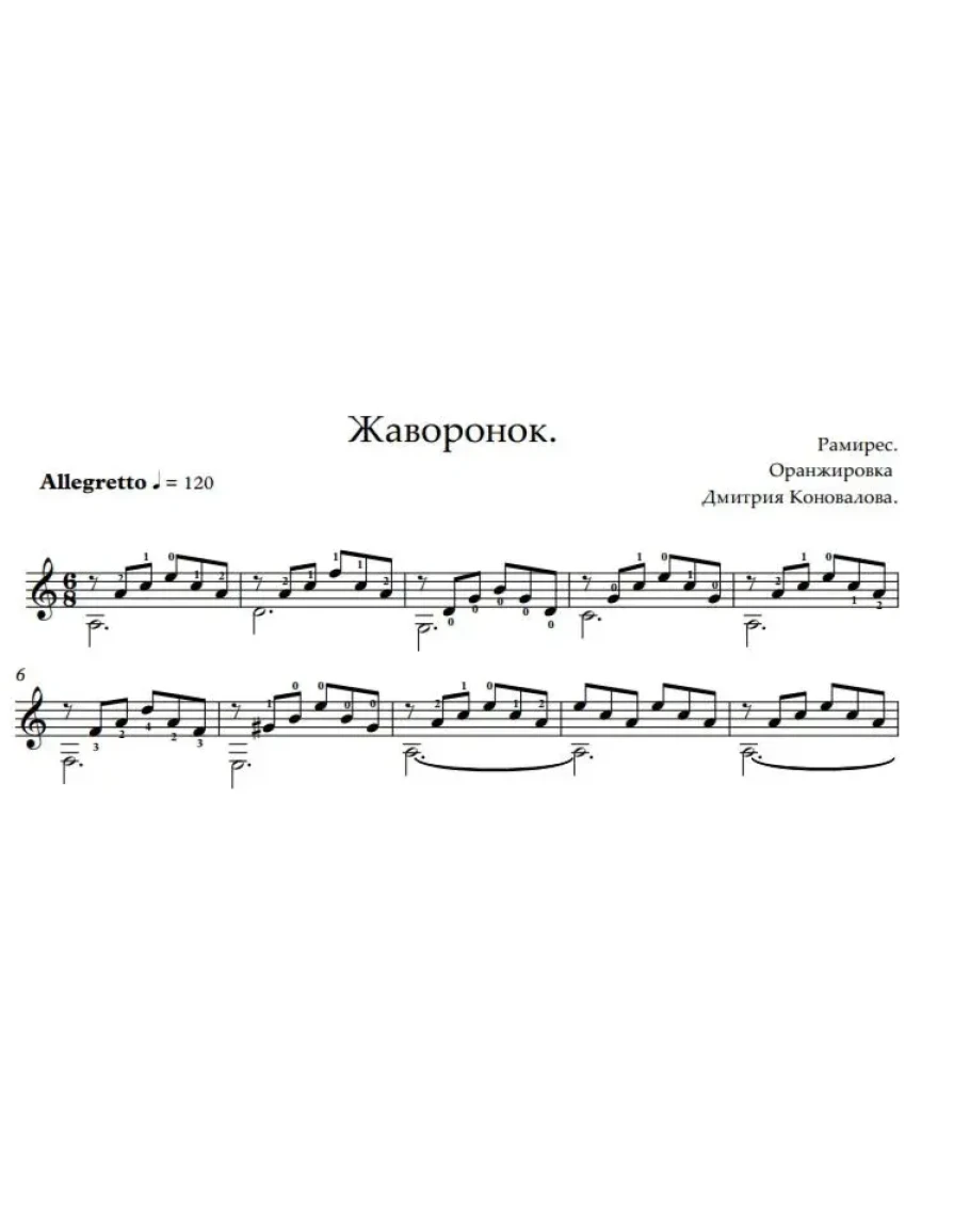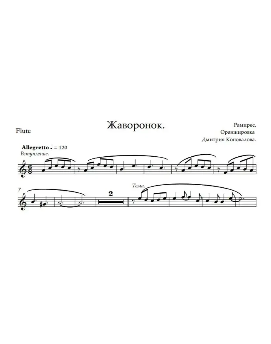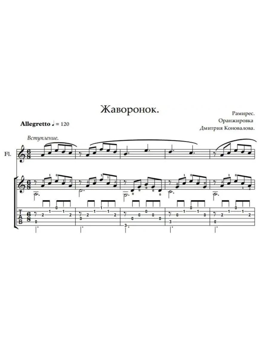 Жаворонок .Ноты дуэта гитара + флейта.