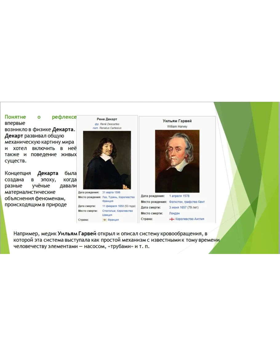 Понятие о рефлексе впервые возникло в физике Декарта. Декарт развивал общую механическую картину мира и хотел включить в неё также и поведение живых существ. Концепция Декарта была создана в эпоху, когда разные учёные давали материалистические объяснения феноменам, происходящим в природе: например, медик Уильям Гарвей открыл и описал систему кровообращения, в которой эта система выступала как простой механизм с известными к тому времени человечеству элементами — насосом, «трубами» и т. п. Теория Декарта ещё более укрепляла принцип материалистического детерминизма, так как Гарвей рассматривал в качестве механизма только внутреннее устройство тела животного, а Декарт перенёс этот принцип также и на взаимодействие организмов с внешним миром, то есть, по сути, на психическую деятельность. Декарт считал, что взаимодействие организмов с окружающими телами опосредовано нервной машиной, в которой мозг выполняет роль центра, а от него расходятся «нервные трубки». Согласно его схеме, внешние факторы действуют на концы расположенных в теле нервных «нитей», которые, натягиваясь, открывают клапаны отверстий, ведущих из мозга в нервы. По этим открытым каналам «животные духи» (выражение Декарта) устремляются в соответствующие мышцы, которые в результате «надуваются». Таким образом Декарт утверждал, что причина двигательного акта не является продуктом мозга или души, а лежит извне, снаружи организма. Работа Декарта была результатом вдохновляющего влияния Гарвея: Декарт писал, что по движениям органов кровообращения «как по первому и самому общему, что наблюдают в животных, можно легко судить и обо всем остальном». Хотя термин «рефлекс» у Декарта отсутствует, ему удалось наметить контуры этого понятия вполне отчетливо: И. П. Павлов считал именно Декарта основоположником понятия «рефлекс» в физиологии и писал, что «Считая деятельность животных, в противоположность человеческой, машинообразной, Декарт… установил понятие рефлекса как основного акта нервной системы»[2].