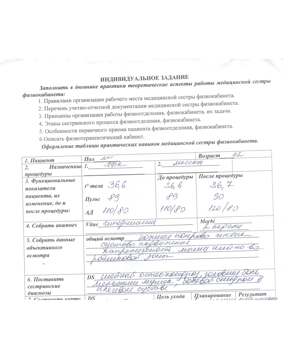 - Индивидуальное задание оформленное в таблице практических навыков медицинской сестры в физиокабинете работа с пациентами