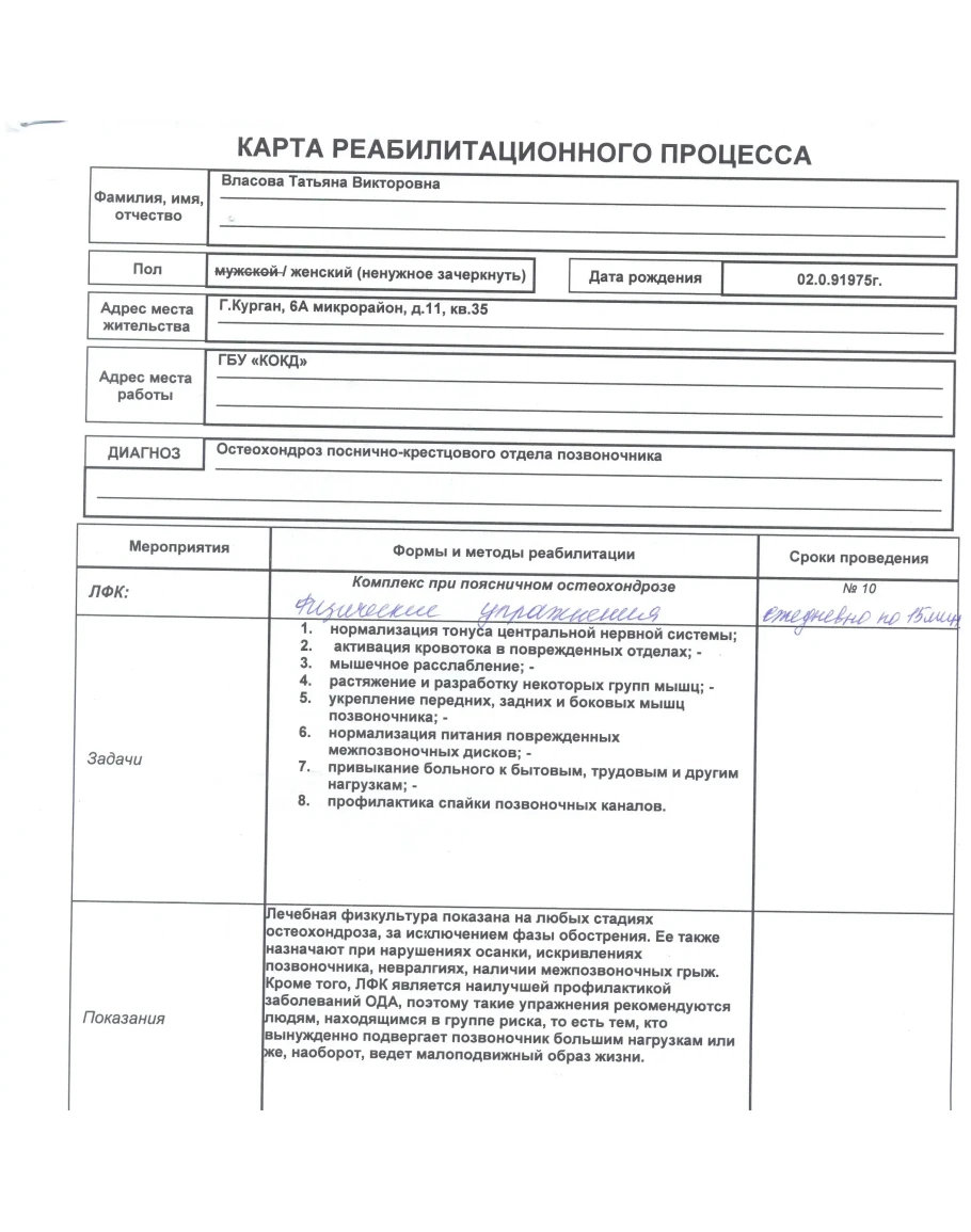 - Карта реабилитационного процесса с применением ЛФК гимнастики и массажа по заболеваниям: