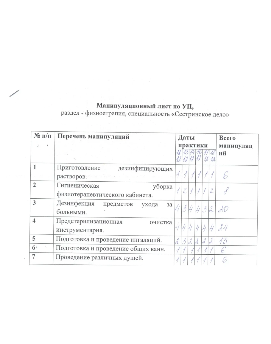 - Манипуляционный лист с перечнем манипуляций по графику практики