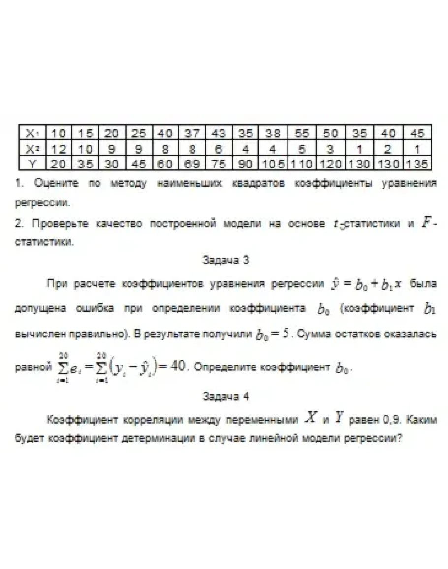 При расчете коэффициентов уравнения регрессии была допущена ошибка при определении коэффициента (коэффициент вычислен правильно). В результате получили . Сумма остатков оказалась равной . Определите коэффициент .